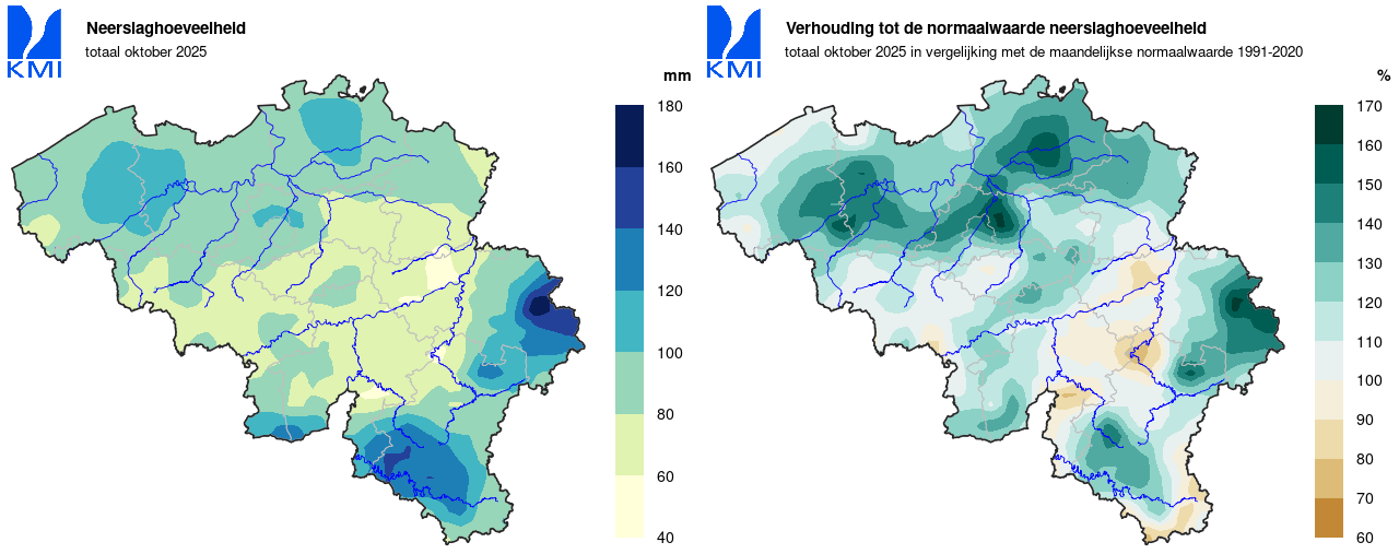 In het klimatologisch meetnet van het KMI werd het grootste dagtotaal (33,2 mm) op 20 oktober in Frassem (Arlon) en op 23 oktober in Rossignol (Tintigny) gemeten.