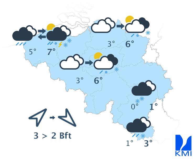 Morgen wordt een wisselvallige en gure dag. Aanvankelijk is er nog winterse neerslag in de Ardennen, en ook aan zee zijn er enkele (eventueel winterse) buien. Vervolgens trekken deze buien van de kust verder landinwaarts en worden in de namiddag gevolgd door nieuwe buien vanaf de Noordzee. In Laag- en Midden-België valt de neerslag als regen, smeltende sneeuw of korrelhagel. Vooral aan zee kan het ook onweren. In de Ardennen valt de neerslag als smeltende sneeuw en sneeuw, zodat tegen de avond op de Ardense hoogten (boven 400 m) een sneeuwlaagje van tot 10 cm of lokaal wat meer kan gevormd worden. De maxima liggen tussen 0 of 1 graad op de Ardense hoogten en 7 graden in Laag-België. De wind eerst waait matig uit het zuidwesten. In de namiddag draait de wind naar noordelijke richtingen in het westen van het land en neemt dan tijdelijk toe naar krachtig tot zeer krachtig. Vooral in het noordwesten kunnen na die windsprong rukwinden voorkomen tot rond 70 km/u en in de kuststrook zelfs tot rond 80 km/u of wat meer.
