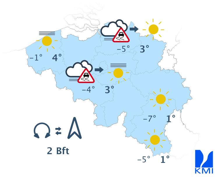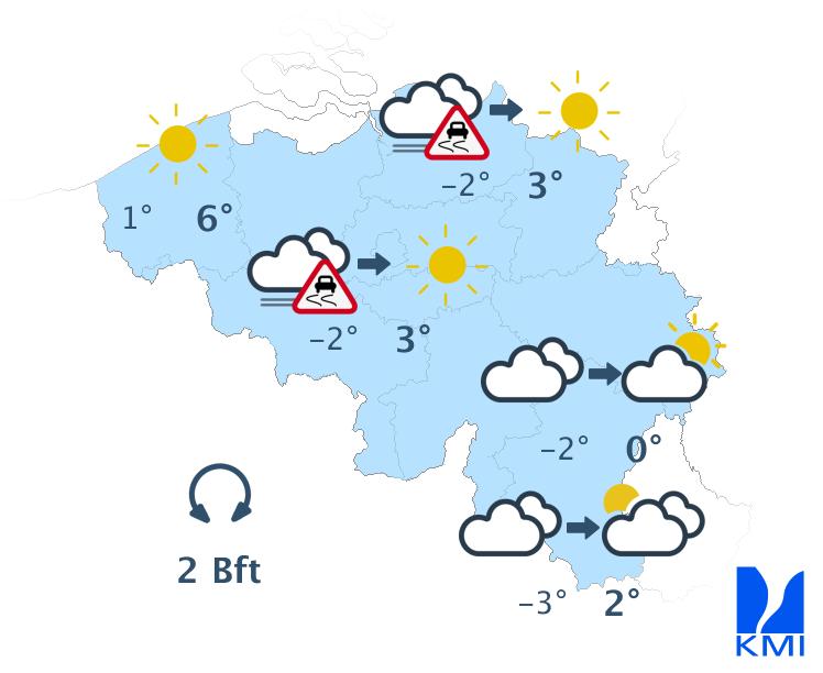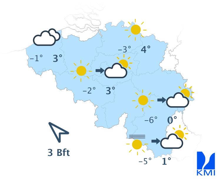 Zaterdagochtend is het koud met lichte tot matige en in de Ardennen boven het sneeuwdek plaatselijk strenge vorst. In bepaalde streken is er aanvriezende mist. In de loop van de dag wordt het vrij zonnig met vanaf het westen wat hoge bewolking. De maxima liggen tussen -1 en 4 graden.
