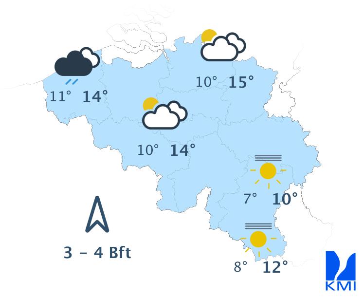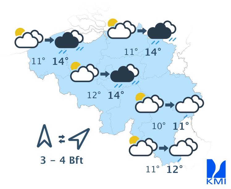Morgen is er veel bewolking met in de voormiddag enkele verspreide buien. 's Namiddags palmt een meer gestructureerde regenzone ons land in vanuit Frankrijk. De maxima liggen tussen 8 graden in de Hoge Venen en 13 graden aan zee. De wind waait meestal matig uit het zuiden tot het zuidwesten.