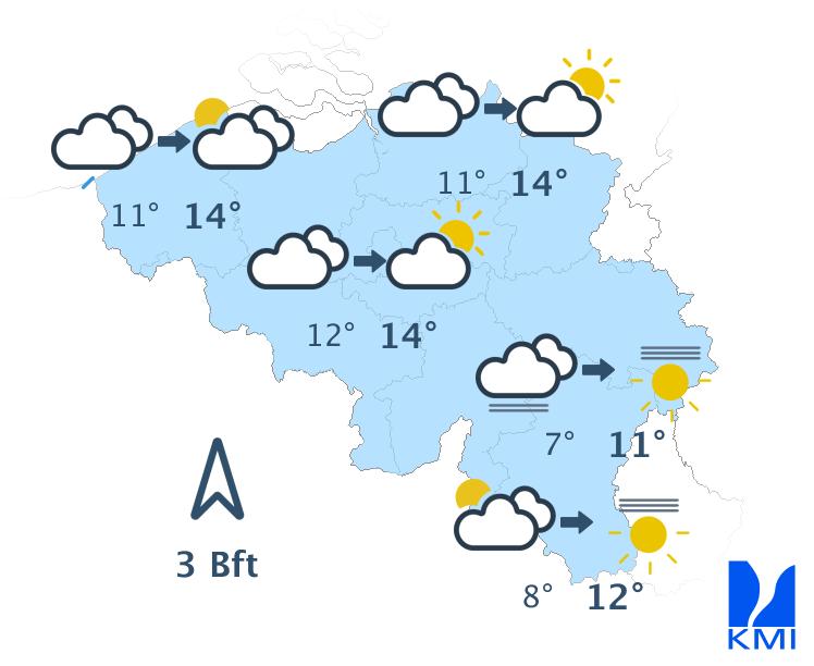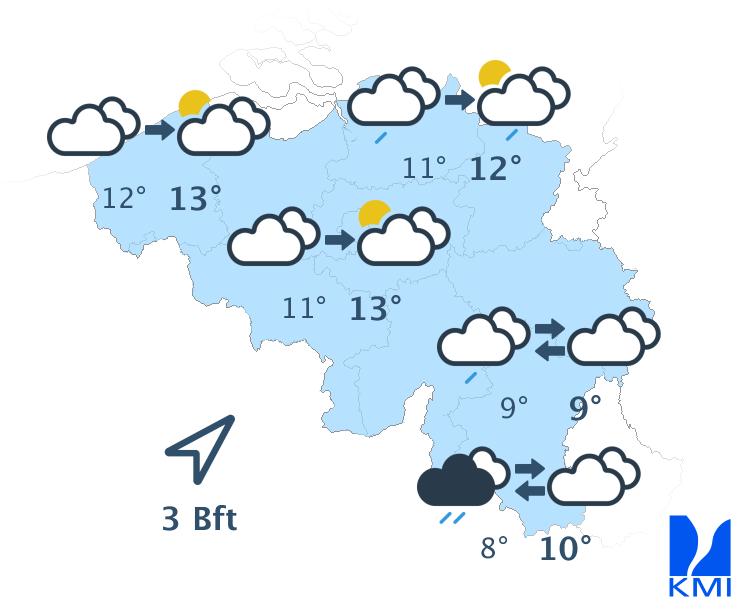 Vandaag is het wisselend tot meestal zwaarbewolkt met soms wat regen of een bui. Na de middag kan het vooral in de noordwestelijke landshelft harder gaan regenen. Het wordt zeer zacht met maxima van 10 tot 12 graden in de Ardennen en rond 13 à 14 graden elders. De wind waait matig en aan zee eerder vrij krachtig uit zuid tot zuidwest met rukwinden tot 50 km/h.