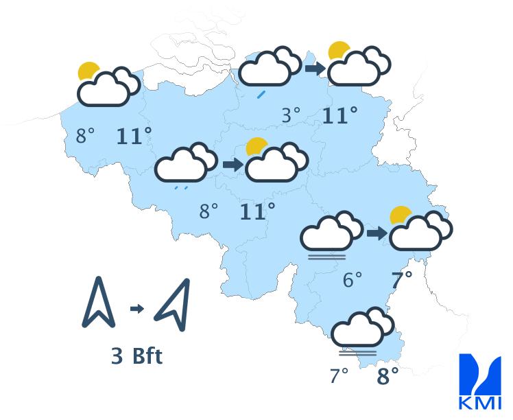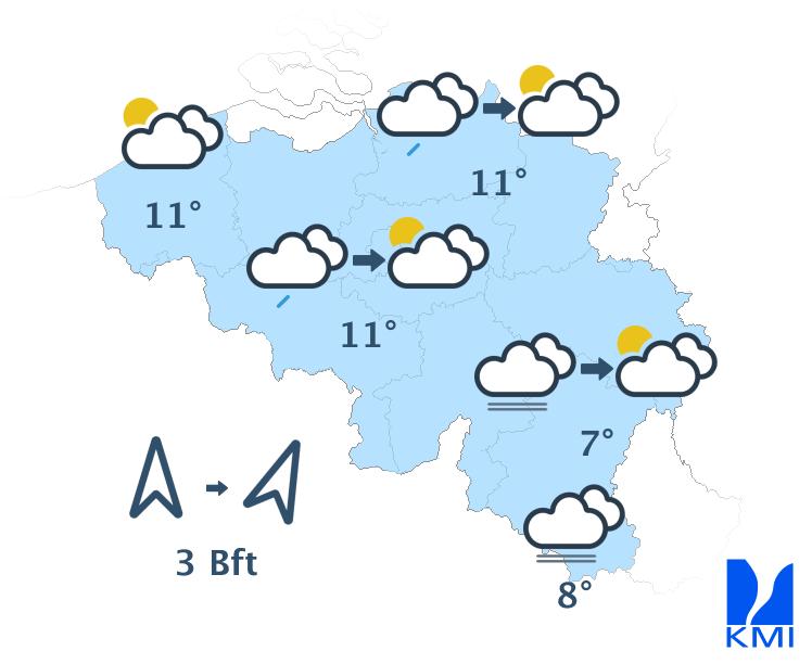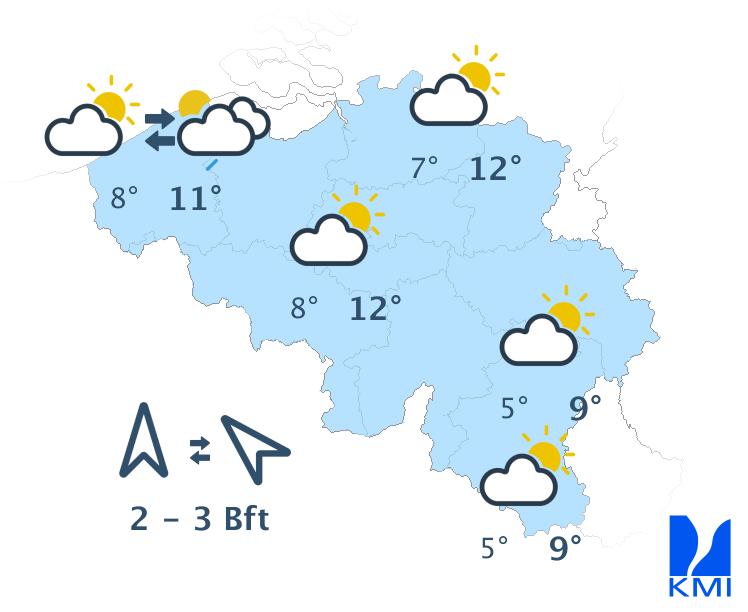 Deze namiddag blijft het droog met wolken en plaatselijke opklaringen. De maxima schommelen tussen 7 graden in de Hoge Venen en 12 graden over het uiterste westen. Er waait een zwakke tot matige wind uit zuidelijke richtingen.