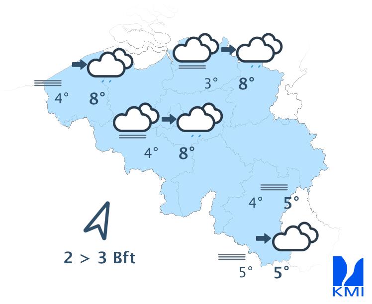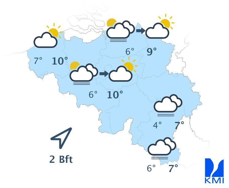Vanavond verwachten we wolken en opklaringen die lokaal breed kunnen worden. In het begin van de nacht zijn er nog plaatselijke opklaringen, maar later wordt het in vele streken zwaarbewolkt met eventueel hier en daar wat gedruppel. Er is kans op nevel of mist, vooral dan in de Ardennen en in Belgisch Lotharingen. De minima liggen tussen 3 à 4 graden in de Hoge Ardennen en 8 graden aan zee. Vanavond is de zuiden- tot zuidwestenwind soms matig, vannacht wordt hij zwak. Aan zee draait de meestal matige wind van zuidzuidwest naar westnoordwest.
