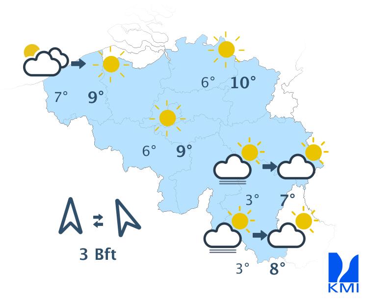 Na het verdwijnen van enkele lage wolkenvelden wordt het maandag vrij zonnig met soms middelhoge wolken. Het wordt opnieuw zacht met maxima van 6 à 8 graden in de Ardennen tot 11 of 12 graden in Laag- en Midden-België. De zuidenwind is matig.