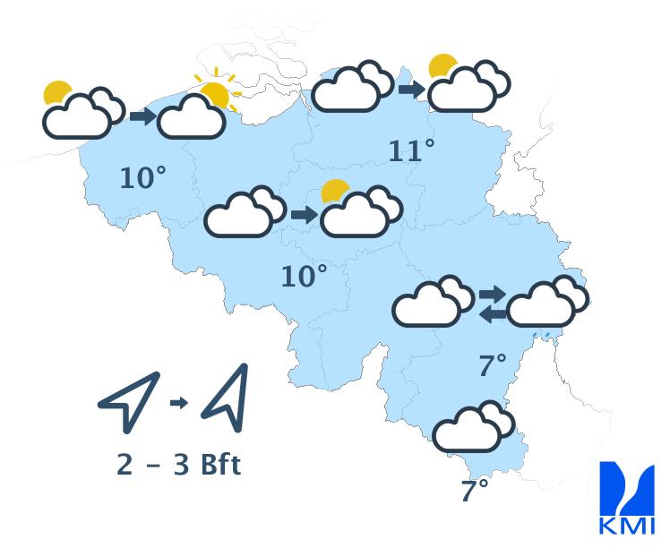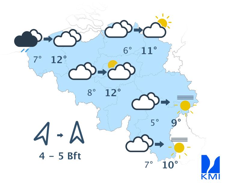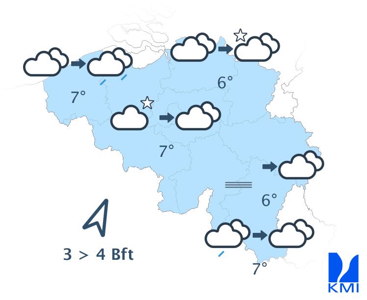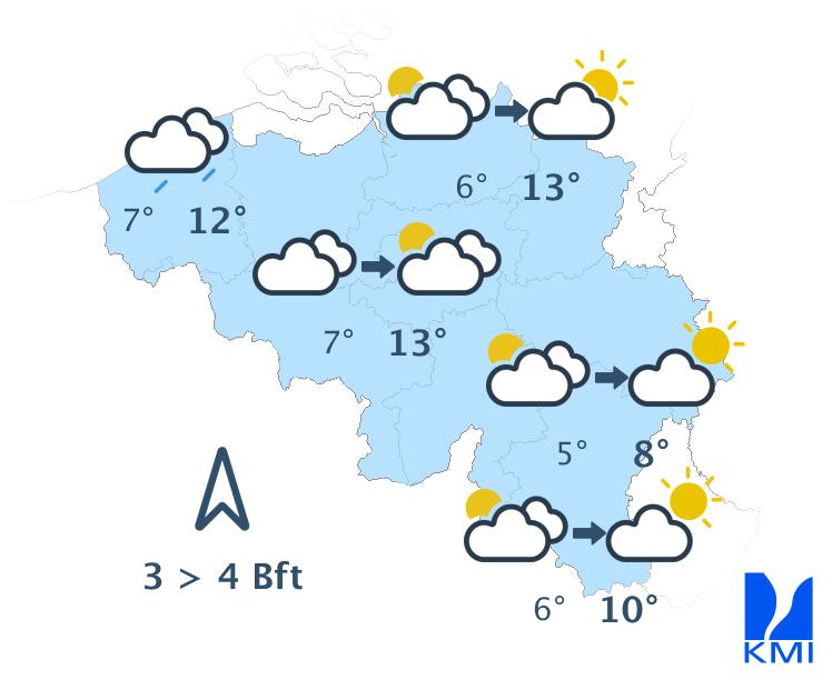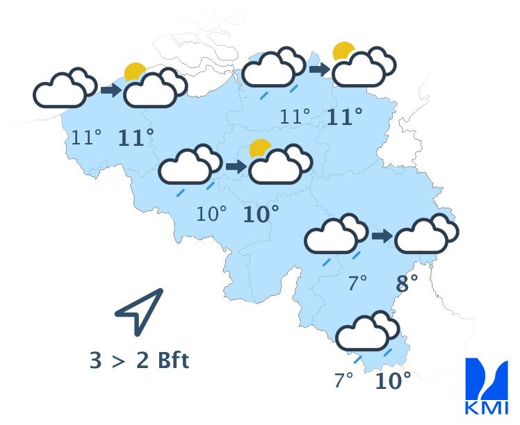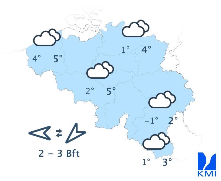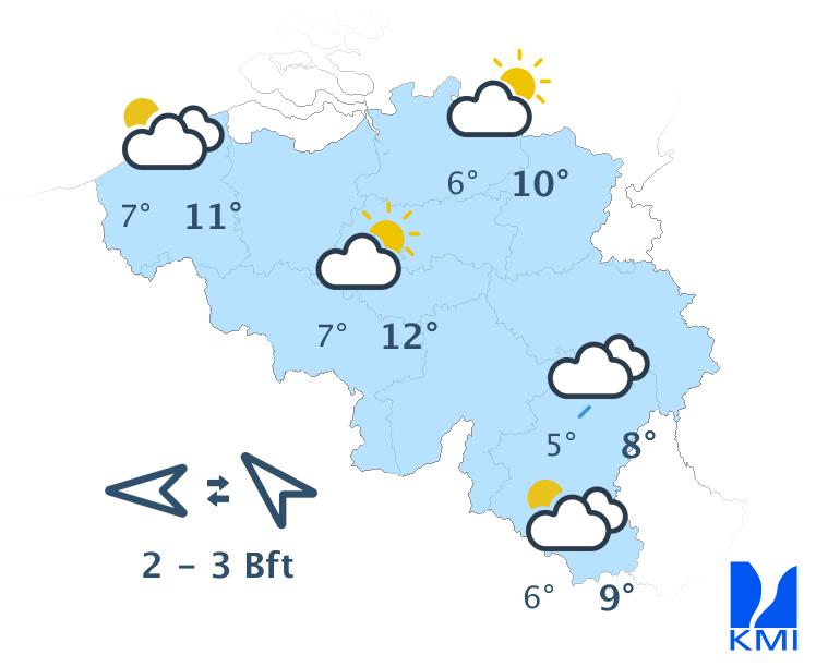 Deze namiddag blijft het zwaarbewolkt en grijs in het zuidoosten van het land met kans op wat lichte regen of motregen. Elders wordt het droog met enkele opklaringen over het westen en later ook het centrum. Tegen het eind van de namiddag wordt de hoge en middelhoge bewolking in de kuststreek alweer dikker. De maxima liggen tussen 6 graden in de Hoge Venen en 10 à 11 graden in Laag- en Midden-België. De wind waait zwak tot matig uit zuidzuidwest.