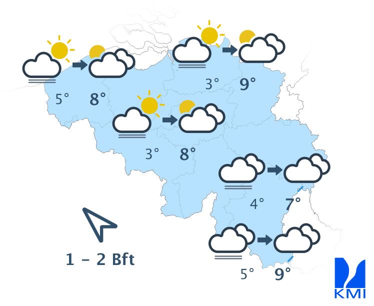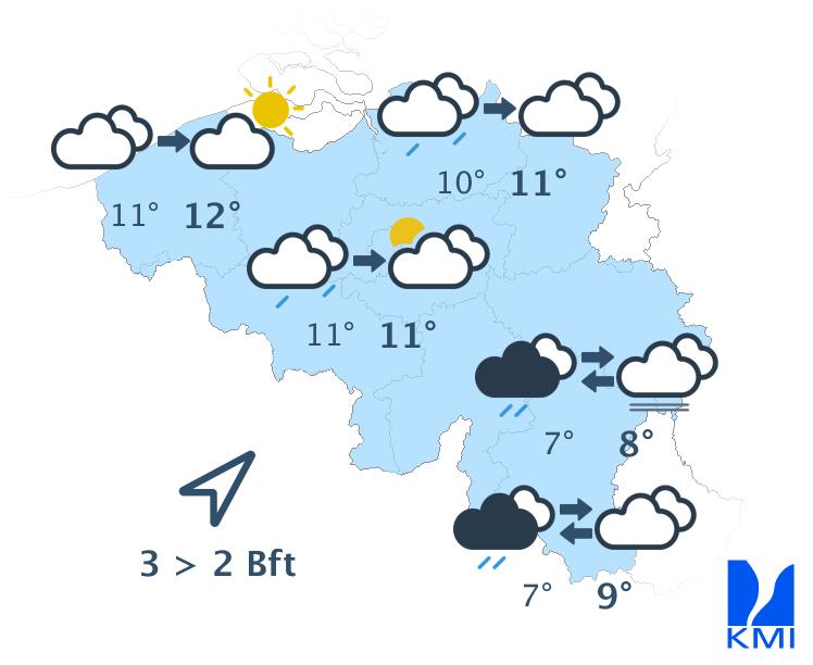 Vanavond en vannacht neemt de bewolking geleidelijk toe vanaf het noordwesten. In de Ardennen is het al en blijft het zwaarbewolkt met kans op nevel of lokale mist. Tegen het eind van de nacht kan er over het westen van het land wat lichte regen vallen. De minima liggen tussen 4 graden in de Hoge Venen en 7 à 8 graden in Vlaanderen. De zuidzuidwesten waait matig en wordt aan zee geleidelijk vrij krachtig.