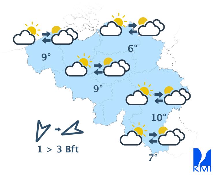 Vannacht vormen er zich voornamelijk in het centrum en westen van het land lage wolken en eventueel ook nevel en (lokaal aanvriezende) mist. In de oostelijke landshelft zijn de opklaringen breder zelfs als er soms hoge en middelhoge wolkenvelden aanwezig zijn. Onder de opklaringen koelt het goed af. De minima liggen tussen 0 en -3 graden in Hoog-België, tussen 0 en +2 graden in Midden-België en rond +3 graden aan zee. Lokaal kunnen er enkele rijmplekken ontstaan. De wind waait zwak tot matig en draait overal naar het oosten tot noordoosten.