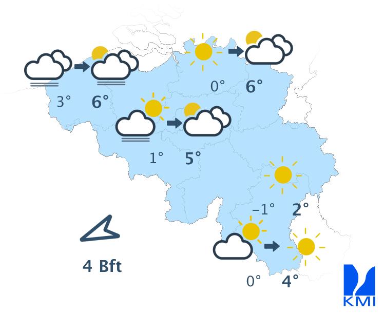 Dinsdag begint met ochtendgrijs in het westen en centrum van het land, en meer plaatselijk ook in de Ardennen, terwijl er elders brede opklaringen zijn. In de namiddag wordt het bewolkt in de noordelijke landshelft. Elders wordt het dan vrij zonnig. De temperaturen klimmen niet hoger dan 2 of 3 graden in de Ardense toppen en 5 of 6 graden in Laag-België. Er waait een matige oostnoordoostenwind.