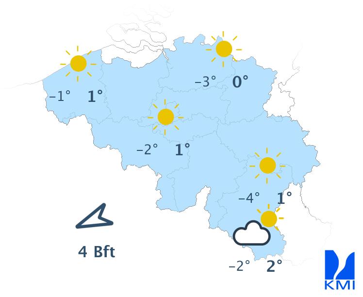 Vrijdag blijft het zonnig. Na een koude ochtend met overal vorst, klimt het kwik naar 0 tot 3 graden in de meeste streken. Op de Ardense hoogten kunnen de temperaturen plaatselijk 5 graden halen. De wind waait zwak tot meestal matig uit oost tot noordoost.
