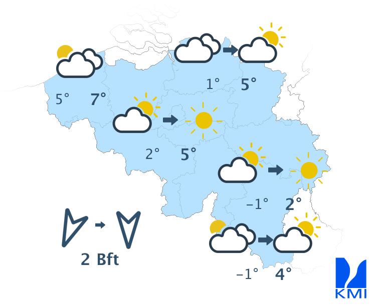 Vanavond wordt het overal zwaarbewolkt met lage wolken. Mogelijk kan er wat lichte motregen of motsneeuw uit de bewolking vallen. In de loop van de nacht verschijnen er opklaringen, vooral dan in de oostelijke helft van het land. De minima liggen tussen -1 of -2 graden in de Ardennen en +4 of +5 graden aan zee. De wind is zwak tot soms matig uit noord tot noordoost.