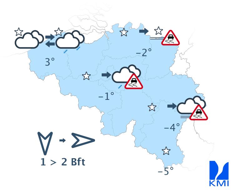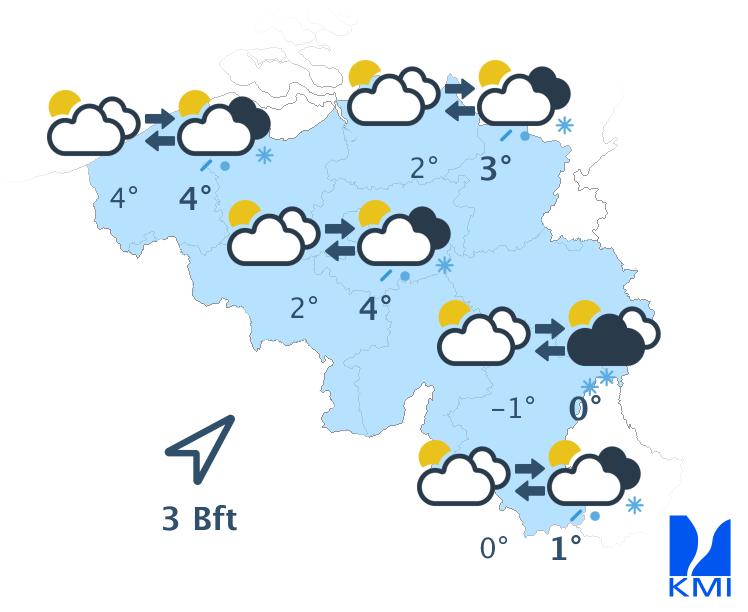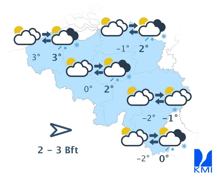 Vanavond en tijdens het eerste deel van de nacht wordt het zwaarbewolkt met kans op wat regen of motregen vanuit het noorden. In de Ardennen valt er wat lichte sneeuw of motsneeuw met daar ook kans op aanvriezende mist. Later vannacht vergroot de kans op enkele opklaringen. Plaatselijk kunnen er ijsplekken ontstaan. De minima schommelen van -3 graden in de Ardennen, 0 graden in het centrum en +4 graden aan zee. Er waait een zwakke tot matige wind uit noord tot noordoost.