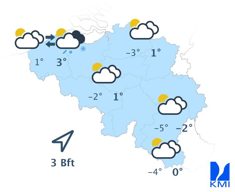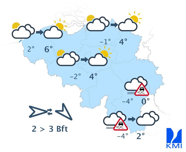 Dinsdagochtend is het opletten voor de aanwezigheid van ijsplekken, vooral in de regio’s van het centrum tot het oosten van het land. In de loop van de dag breiden de opklaringen, die ’s ochtends al aanwezig zijn, zich uit vanaf het noorden en uiteindelijk wordt het in de meeste streken zonnig. In het westen en noordwesten blijft blijven er evenwel meer wolken hangen met aan het einde van de dag zelfs kans op een lichte bui aan de kust. De maxima liggen tussen 0 graden in de Oostkantons, 4 à 5 graden in het centrum en rond 7 graden aan zee, bij een zwakke tot matige wind uit noord tot noordoost.