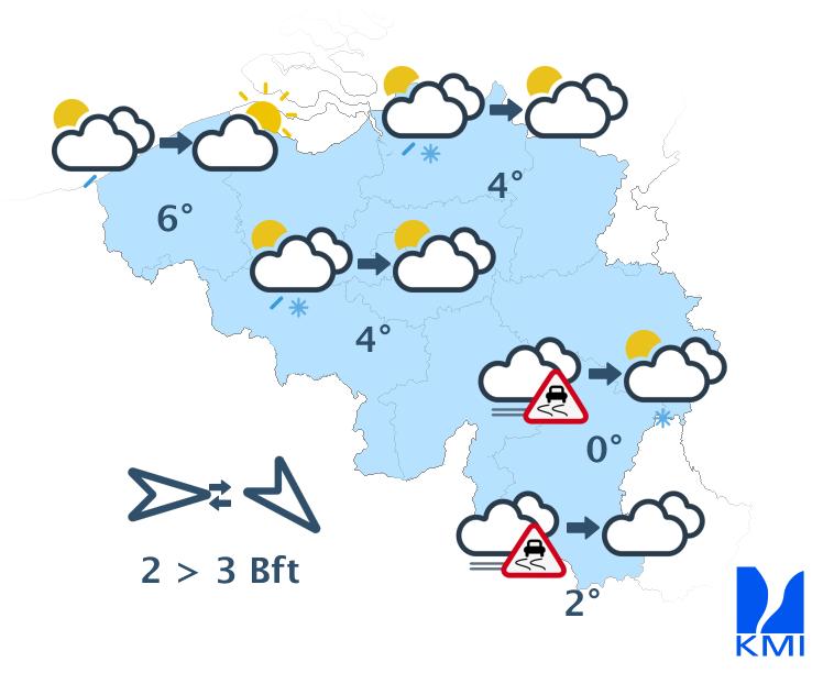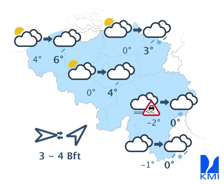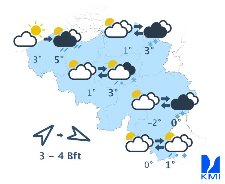 Vrijdagochtend is het wisselend tot zwaarbewolkt met vooral in het oosten en zuidoosten van het land enkele sneeuwbuien. Elders vallen er eerder plaatselijk winterse buien. In de namiddag verwachten we meer winterse buien. De maxima liggen tussen -2 graden in de Hoge Venen, +2 of +3 graden in het centrum en +4 graden aan zee. De wind is matig uit het westen met rukwinden tot 50 km/h in de noordelijke landshelft en op de Ardense hoogten. Aan zee waait de wind vrij krachtig tot krachtig met rukwinden tot 55 km/h.
