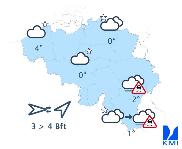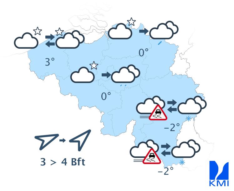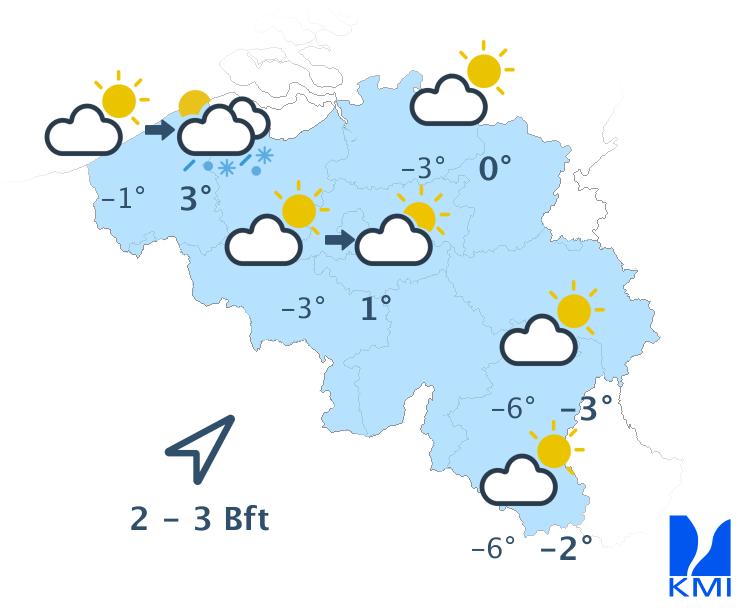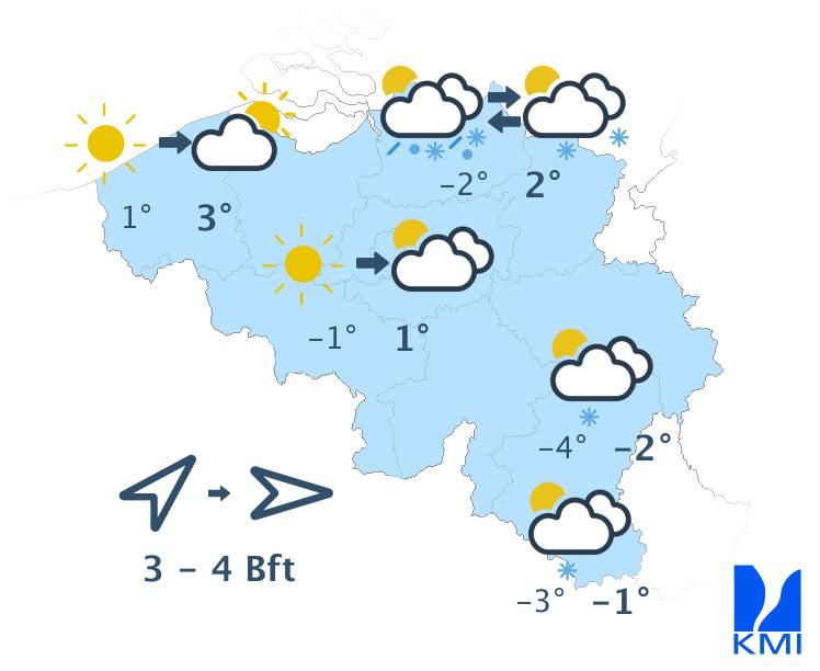 Zondag start wisselend bewolkt met vooral over de oostelijke landshelft winterse buien. In de loop van de dag verbreden de opklaringen en wordt het droger. We halen maxima van -3 graden in de Hoge Ardennen, 0 graden in het centrum tot +2 graden aan zee. De wind is meestal matig uit westelijke richtingen. Aan zee is het matig tot vrij krachtig uit het noordwesten.