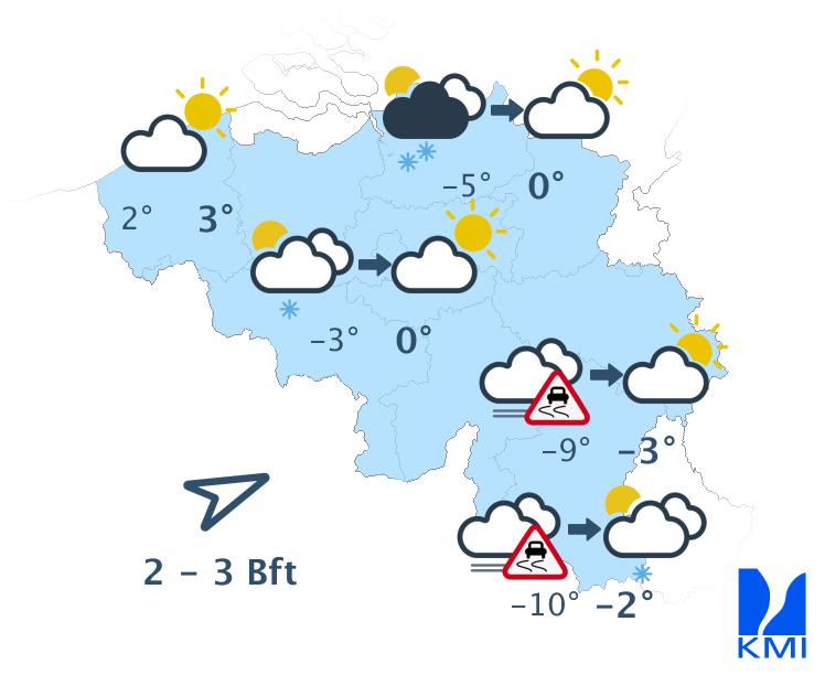 Maandag begint op veel plaatsen zonnig. In het zuidoosten is het echter grijs met veel lage bewolking en eventueel aanvriezende mist. Geleidelijk verschijnt er ook elders meer bewolking. Vooral in het noorden is er kans op enkele sneeuwbuien. De maxima liggen rond -3 graden in de Hoge Venen, rond 0 graden in het centrum en rond +3 graden aan de kust. De wind waait meestal zwak uit zuidwest tot west.