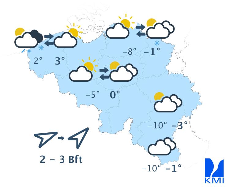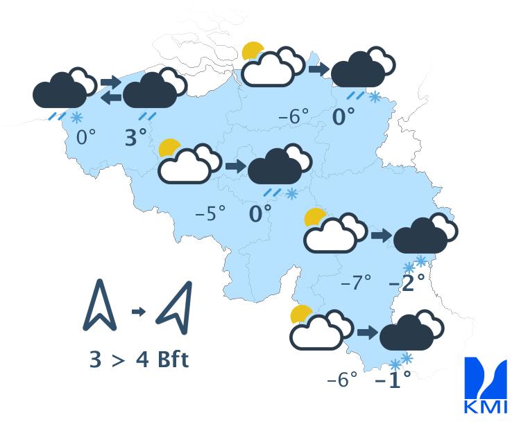 Morgen is het wisselend tot zwaarbewolkt met toenemende kans op winterse buien. In het oosten en soms ook in het centrum valt er sneeuw. De maxima liggen rond -2 graden in de hoge Ardennen, rond +2 graden in het centrum van het land en rond +4 graden aan de kust. De wind is over het algemeen matig uit het westen met windstoten tot 50 km/h. Aan de kust waait hij vrij krachtig tot krachtig met windstoten tot 60 km/h.
