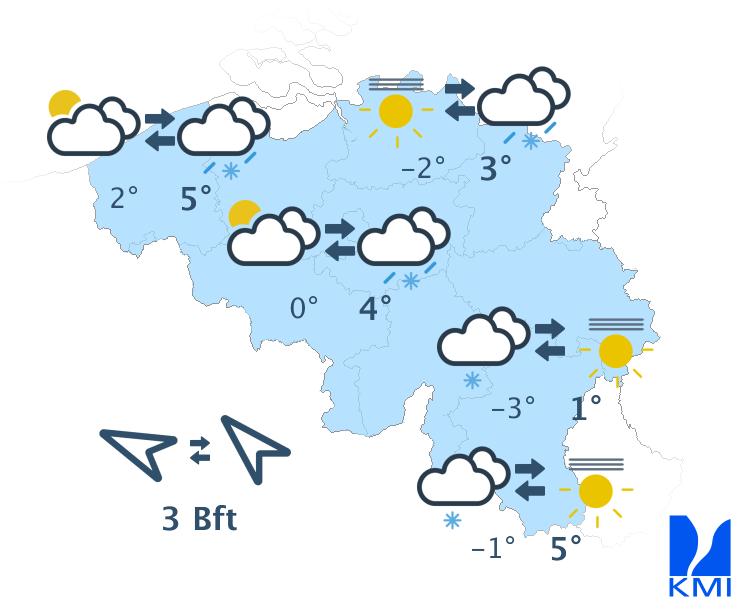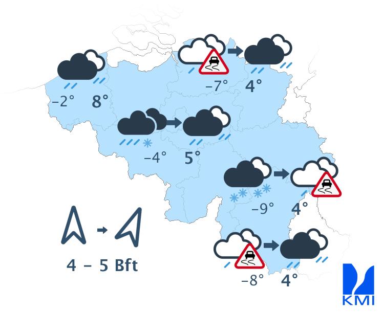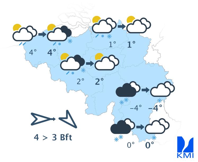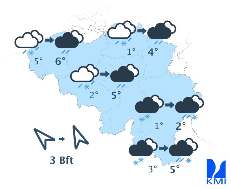 Morgen wordt het overal betrokken vanaf het zuidwesten. Een eerste zwakke neerslagzone steekt ons land over vanuit Frankrijk. In het zuidwesten is het niet uitgesloten dat de lichte regen lokaal kan aanvriezen. Op de zuidelijke flank van de Ardennen kan er wat sneeuw vallen. 's Namiddags trekt de lichte regen naar het noorden van het land en valt er (smeltende) sneeuw in het noorden van de Ardennen. Op het einde van de namiddag en 's avonds palmt een actievere regenzone snel het hele land in, eveneens vanuit Frankrijk. In de Ardennen kan de neerslag tijdelijk nog als sneeuw vallen. De temperaturen liggen op het einde van de dag tussen 0 graden in de Hoge Venen en 5 graden aan zee. Tijdens de avond en nacht blijven ze stijgen. De wind waait zwak tot matig uit zuidelijke richtingen.
