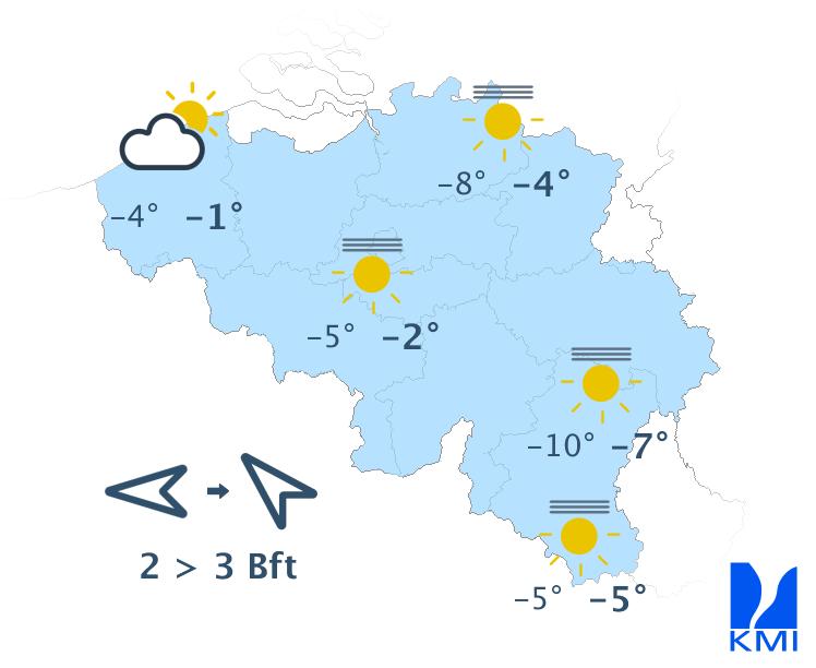 Zondag blijft het droog met op de meeste plaatsen veel bewolking. Enkele mooie opklaringen zijn wel mogelijk. Het blijft overal vriezen: de maxima liggen tussen -5 graden in de Hoge Venen en -1 graad aan zee. De wind waait meestal zwak uit noordoost, ruimend naar zuidoost.