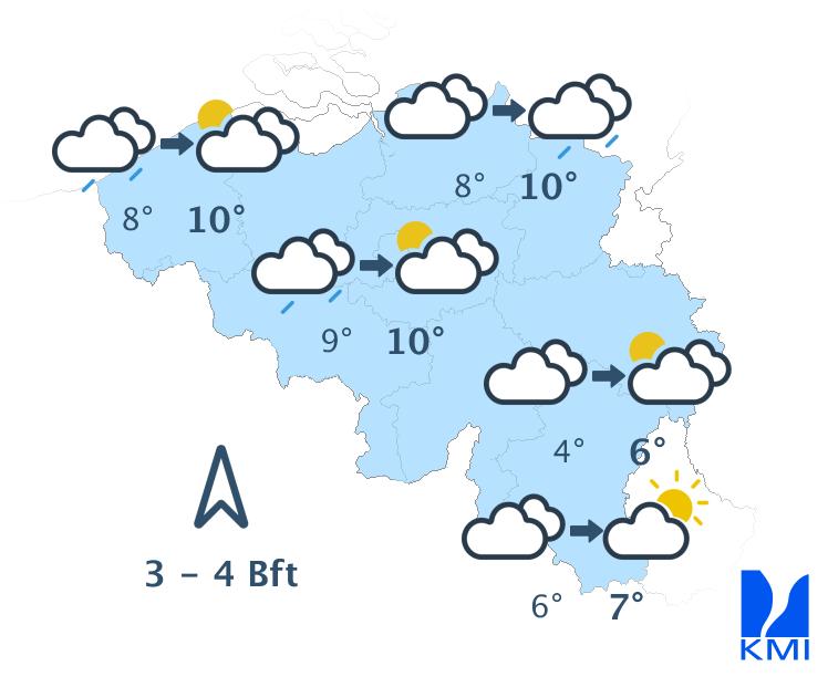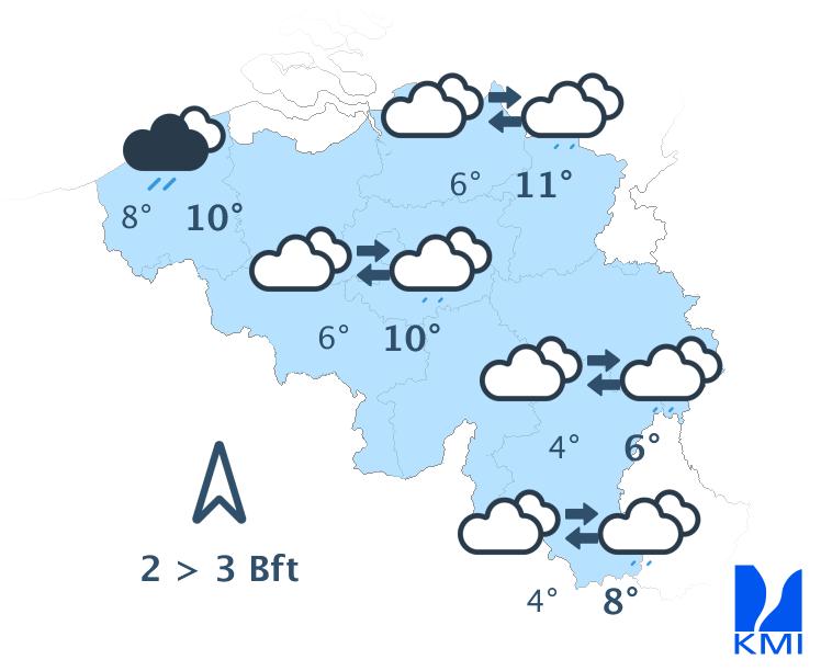 Dinsdag start droog en bewolkt, maar stilaan verwachten we lichte regen vanaf de Franse grens. In Hoog-België lijkt het vaak droog te blijven. In de loop van de namiddag wordt het droog met opklaringen vanaf het zuidwesten. De maxima schommelen tussen 3 of 4 graden in de Hoge Venen en 10 of 11 graden aan zee en in het centrum van het land. De wind is matig uit zuidelijke richtingen.