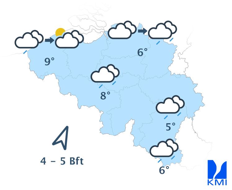 Vanavond is het vermoedelijk al droog over het uiterste noordwesten met enkele opklaringen. Elders is het zwaarbewolkt en valt er bij momenten nog wat regen. Na middernacht is het ook vaak droog in Laag- en Midden-België met af en toe enkele opklaringen. Aan het einde van de nacht is het ook droog in Hoog-België, maar daar blijft het zwaarbewolkt. De minima liggen tussen 3 of 4 graden in de Ardennen en 8 of 9 graden in Vlaanderen. De wind is matig en 's avonds tijdelijk en lokaal nog vrij krachtig uit het zuidwesten. In het centrale deel van het land (en later in de Hoge Venen) zijn er nog rukwinden mogelijk tot 60 km/h.