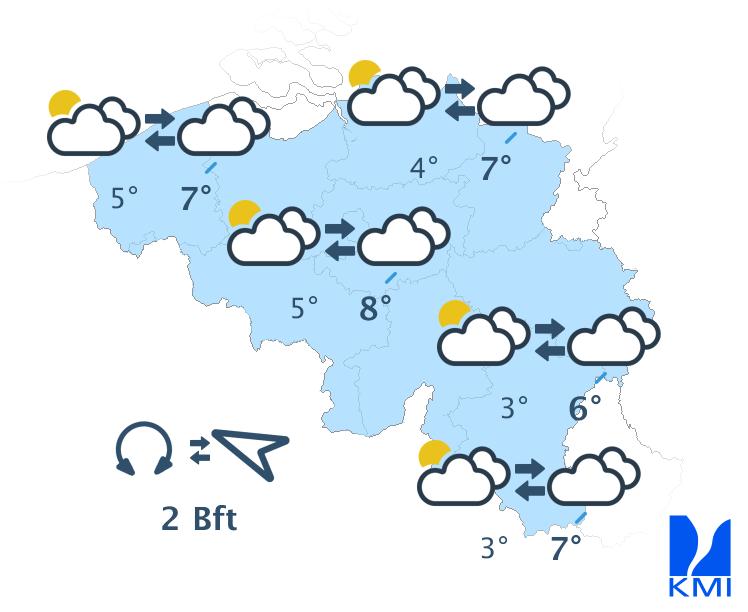 Woensdagochtend zet de regenzone verder koers richting de Ardennen. Aan de achterzijde verschijnen er brede opklaringen vanaf het noordwesten. Ten zuiden van Samber en Maas blijft het echter bewolkt, ook tijdens de namiddag, met nog kans op enkele buien. De maxima liggen tussen 3 graden in de Hoge Venen en 8 graden in de Kempen. De wind is zwak tot matig uit het zuidwesten en ruimt naar het westen tot noordwesten of wordt zwak en variabel.