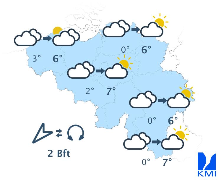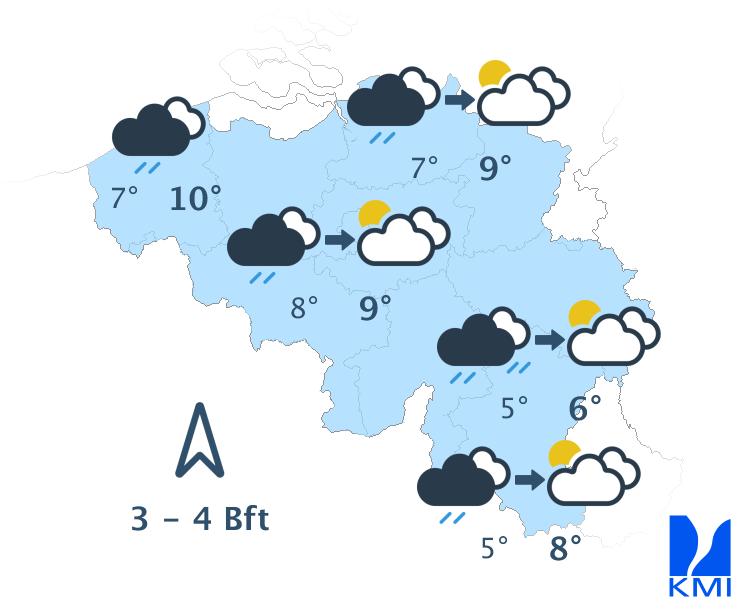 Morgenvroeg trekt er regen van het centrum naar het oosten en verschijnen er aan zee en in het noorden opklaringen. In het centrum en het zuiden van het land blijft het ook in de namiddag waarschijnlijk bewolkt, met vooral in de Ardennen soms wat gedrup. Tegen het einde van de namiddag neemt de kans op buien vanaf het zuidwesten opnieuw toe en verdwijnen de opklaringen in het noorden. De maxima liggen tussen 4 en 9 graden. De wind waait eerst zwak uit noordelijke of veranderlijke richtingen in de noordelijke landshelft en matig uit het zuidwesten in de zuidelijke landshelft. Nadien staat er overal een overwegend zwakke tot matige wind uit zuid tot zuidoost.