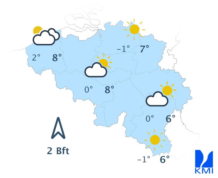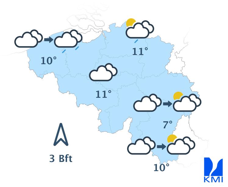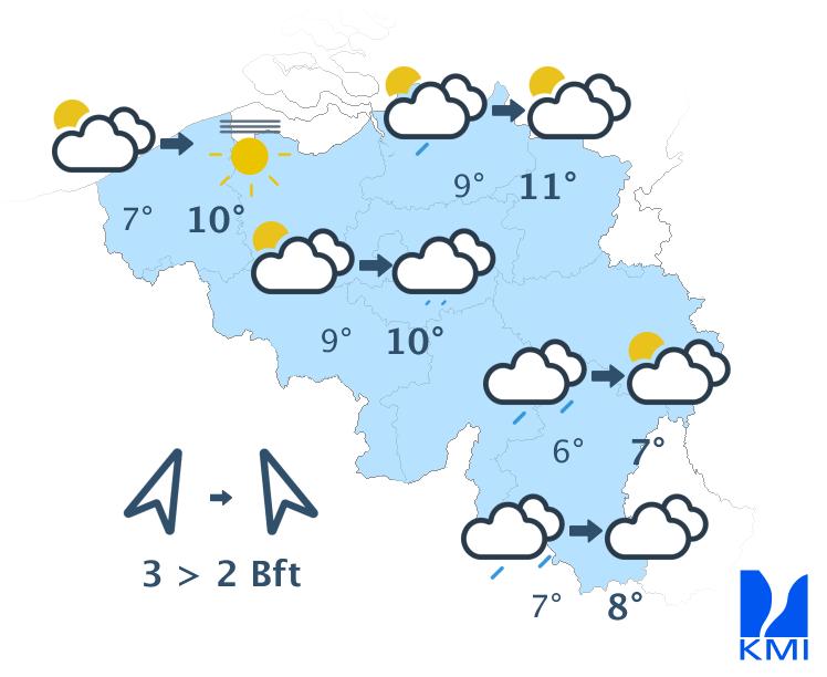 Morgen is het meestal zwaarbewolkt met in de ochtend nog tijdelijk kans op wat lichte regen. In de namiddag wordt het op de meeste plaatsen droog en verschijnen er enkele korte opklaringen. Enkel in het westen en vooral aan de kust blijft het zwaarbewolkt met kans op lichte regen. De maxima schommelen tussen 6 en 10 graden bij een matige zuiden- tot zuidzuidwestenwind.