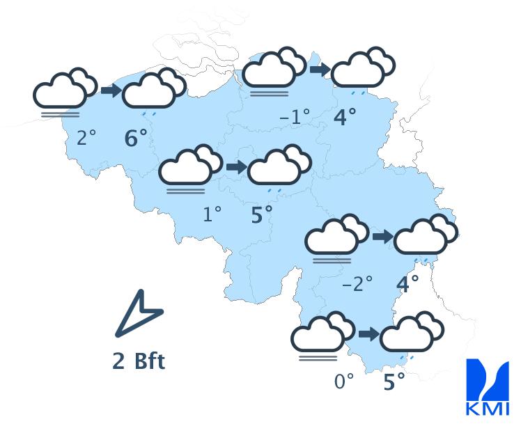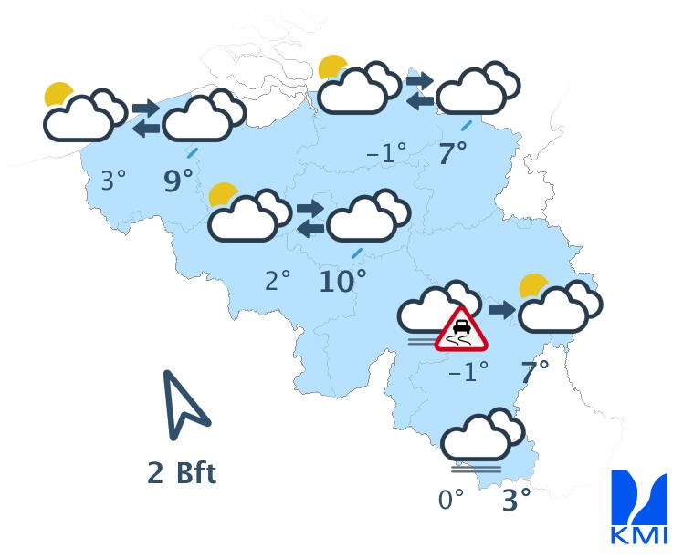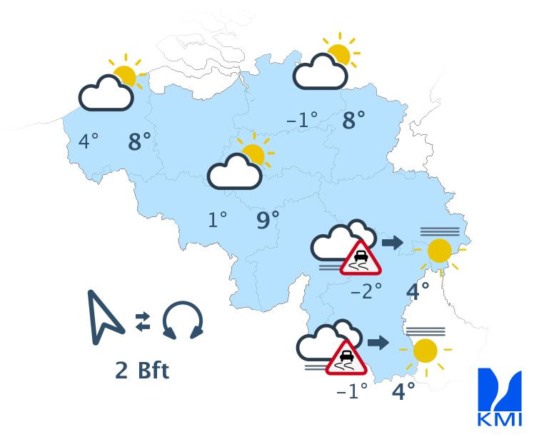 Vanavond is het eerst nog bewolkt, maar stilaan verschijnen er vooral over de oostelijke landshelft brede opklaringen. Vannacht verwachten we in de Ardennen en Belgisch Lotharingen opnieuw lage wolken met kans op (aanvriezende) mist en rijmplekken. De minima liggen tussen -3 en 0 graden in Hoog-België en tussen 0 en +4 graden elders. De wind blijft zwak en in het uiterste westen matig uit zuid tot zuidoost.