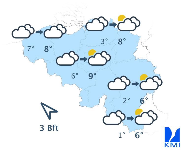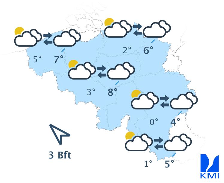 Woensdagochtend zijn er veel wolkenvelden in het westen en het centrum van het land. In het uiterste westen kunnen er zelfs enkele regendruppels vallen. In het oosten zijn er mooie, zonnige perioden, met een sluier van hoge wolken. In de loop van de namiddag krijgen we dit weertype ook in het westen. De maxima liggen tussen 4 of 5 graden in de Ardennen en 9 of 10 graden in Laag-België. De wind waait zwak tot matig uit oost tot zuidoost.