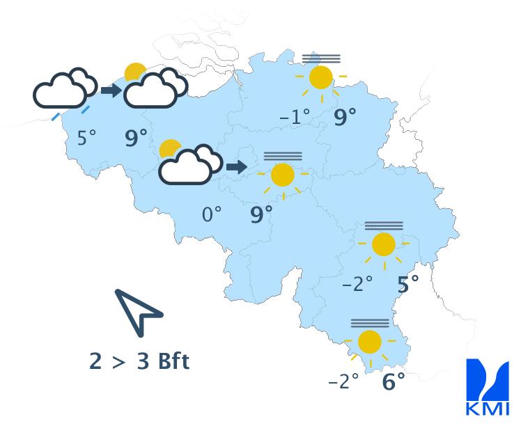 Dinsdag start zonnig in de oostelijke landshelft (met uitzondering van de Ardennen en Belgisch Lotharingen) en wisselend bewolkt in het westen. Stilaan wordt het overal zonnig met soms wat hoge wolkensluiers. Aan het einde van de namiddag verschijnen er meer wolken in het westen. De maxima schommelen tussen 2 en 9 graden, afhankelijk van de opklaringen. De wind waait zwak tot soms matig uit zuid tot zuidoost of uit veranderlijke richtingen.