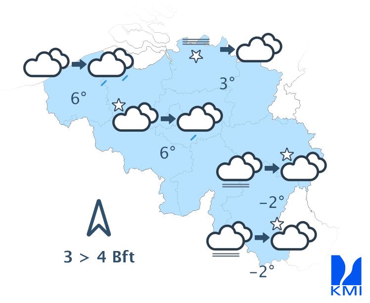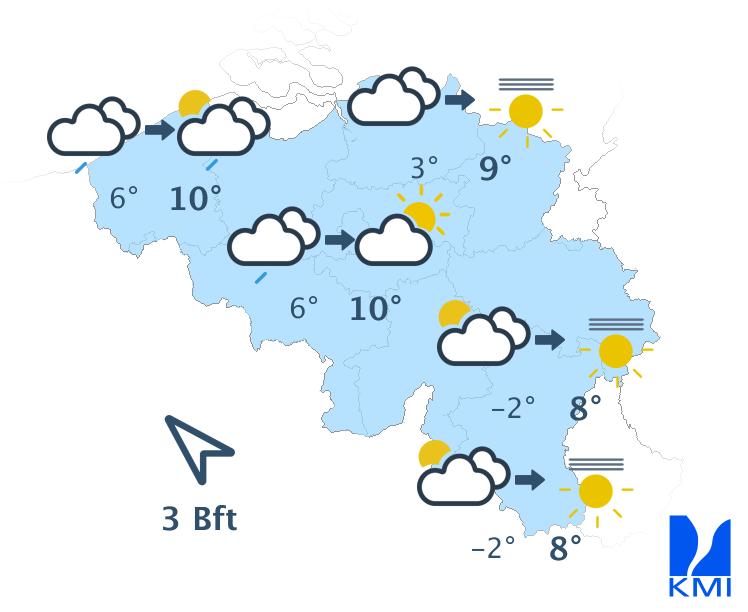 Woensdagochtend is het zwaarbewolkt op de meeste plaatsen met kans op lichte regen van het westen tot het centrum van het land. In de namiddag verschijnen er bredere opklaringen vanaf de Franse grens en blijft het droog, met uitzondering van het uiterste westen, waar een buitje mogelijk blijft. De maxima schommelen tussen 4 graden in het uiterste oosten en 10 graden in Vlaanderen. De wind is matig uit het zuidoosten.