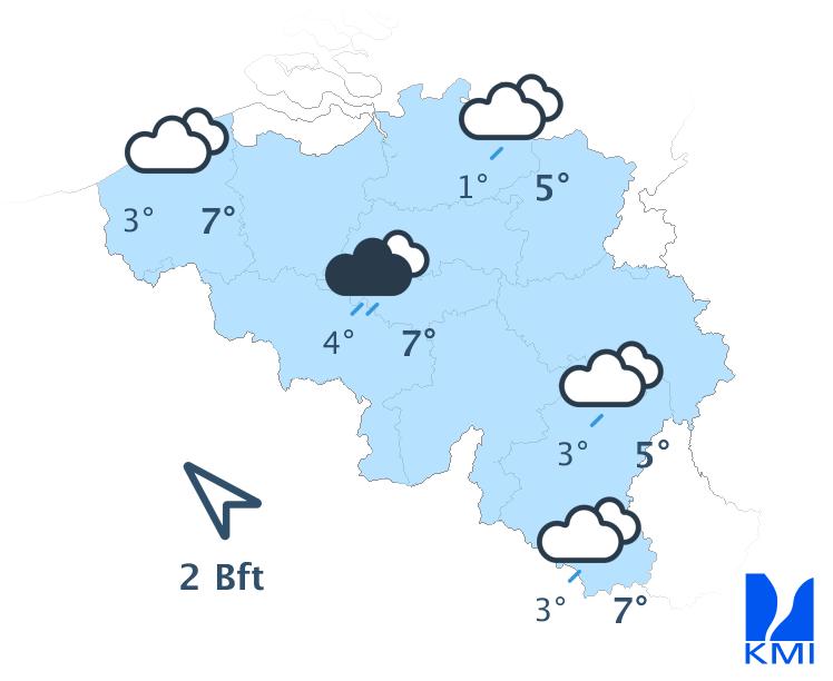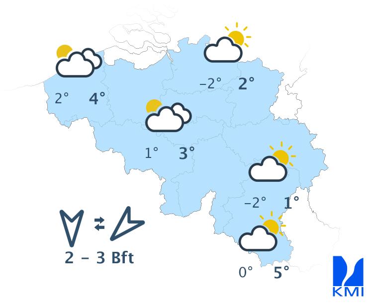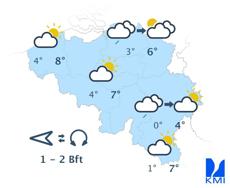 Morgen neemt de bewolking toe vanaf het zuidwesten en is een spatje regen, vooral in het westen en het centrum, niet uitgesloten. De maxima liggen tussen 3 en 8 graden ten zuiden van Samber en Maas, rond 8 graden aan de kust en rond 9 à 10 graden in het centrum. De wind waait zwak tot matig uit oost tot zuidoost, later ruimend naar zuidoost tot zuidzuidoost. Aan zee waait de wind matig.