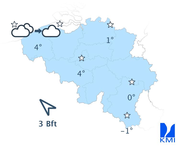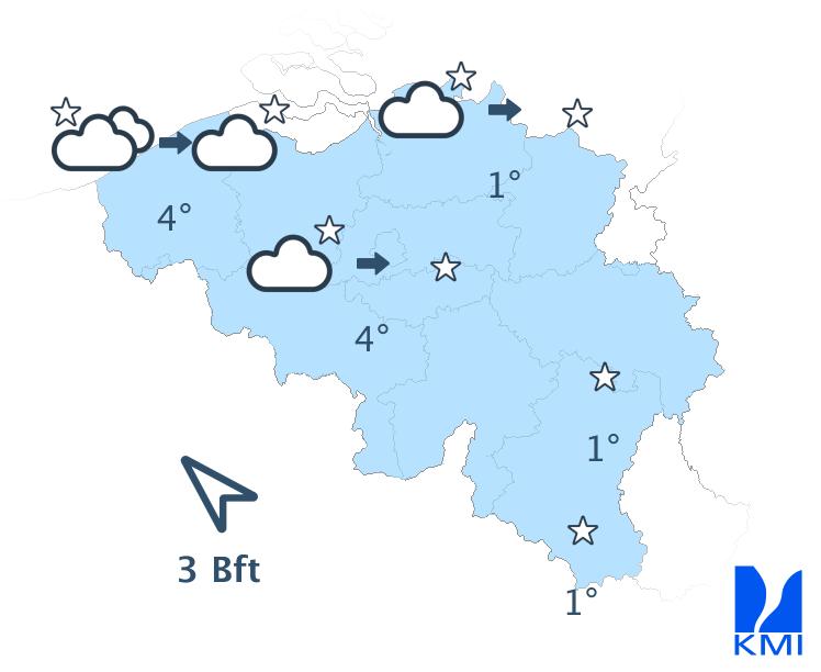 Vannacht wordt het op de meeste plaatsen licht bewolkt met enkel nog wat hoge wolkenvelden en vooral in het zuidwesten middelhoge wolken. De minima liggen tussen 0 graden in de Hoge Venen en 3 à 4 graden in het centrum en aan de kust. De wind waait zwak tot matig uit het oosten tot zuidoosten.