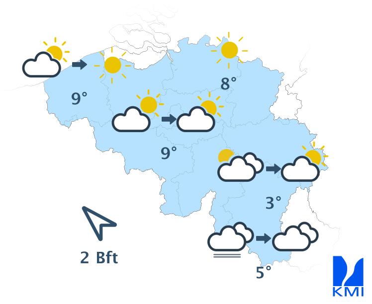 Morgen wordt het, na een vrij bewolkte start in het oosten van het land met plaatselijk mist in de Ardennen en nog enkele sneeuwvlokken in de streken nabij Duitsland, overal vrij zonnig met soms een door hoge wolken versluierde zon. Het wordt zacht voor de tijd van het jaar met maxima van 4 graden in de Hoge Ardennen tot plaatselijk 9 graden in Vlaanderen. De wind is meestal zwak uit oost tot zuidoost.