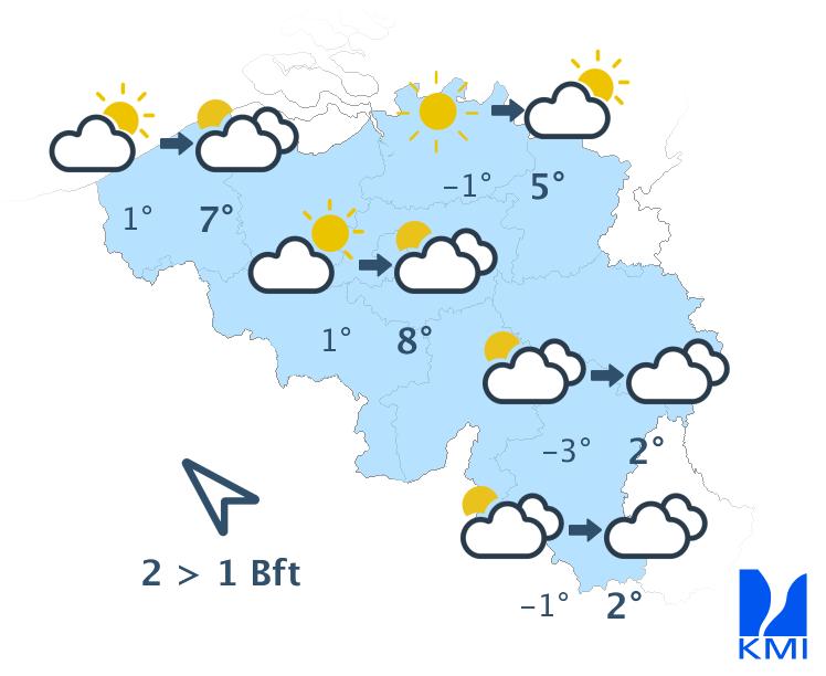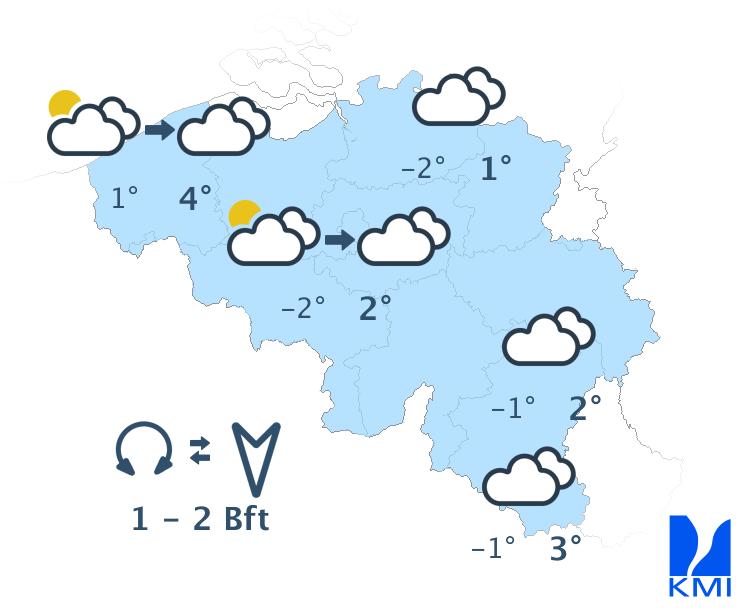 Maandag is het veelal bewolkt en overwegend droog. Het is vrij koud met maxima rond +1 à +2 graden in het centrum. De wind is zwak veranderlijk.