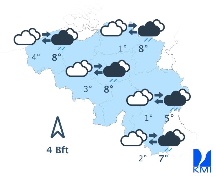 Dinsdag trekt een neerslagzone vanuit Frankrijk naar ons land. Eerst is het nog droog met al veel wolken, maar in de loop van de namiddag wordt het betrokken en trekt de regen binnen. Over de Ardennen kan de eerste neerslag winters van karakter zijn en in de Hoge Venen tijdelijk zelfs wat sneeuw. Het kwik stijgt naar zo'n 5 graden in het centrum bij een matige, aan zee soms vrij krachtige, oostzuidoostenwind.