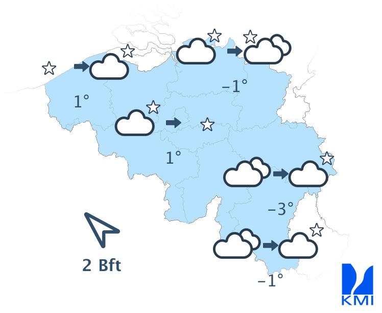 Vannacht komen de opklaringen vooral in het westen van het land voor. In het oosten wordt het opnieuw bewolkter en kan er wat lichte neerslag over de Ardennen trekken. In de Hoge Venen zijn ook enkele sneeuwvlokken mogelijk. In de Ardennen vormen zich lage wolken die plaatselijk het zicht kunnen beperken. De minima liggen tussen 0 graden in de Hoge Venen en lokaal 4 graden in het centrum en aan zee. De wind is zwak tot tijdelijk matig uit zuidoost.