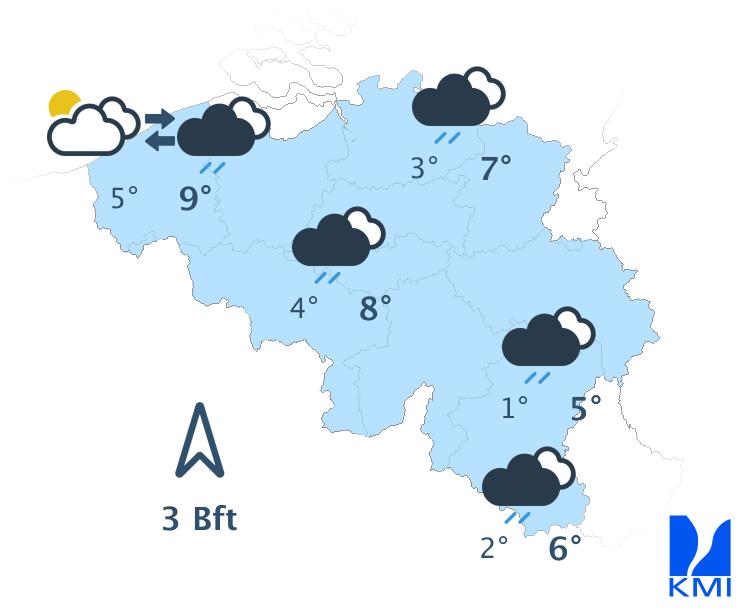 Dinsdagochtend verwachten we in de streken nabij de Duitse en Luxemburgse grens lage wolken die het zicht kunnen belemmeren. Elders hangen er veel middelhoge en hoge wolken als voorbode van een regenzone die ons land bereikt vanaf het westen en het zuidwesten in de loop van de voormiddag. We verwachten regen in Laag- en Midden-België. Op het reliëf kan de neerslag tijdelijk vallen als smeltende sneeuw. Aan het einde van de namiddag wordt het droog met enkele opklaringen in het westen. De maxima liggen tussen 1 en 6 of 7 graden bij een matige wind die draait van zuidoost naar zuid.