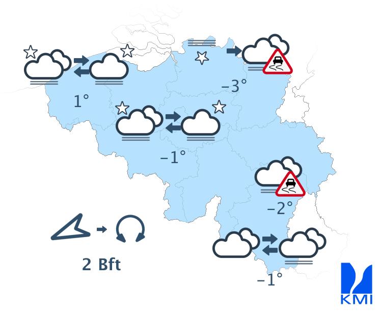 Vannacht is het vaak nevelig met verspreid lage wolken, die in sommige streken tijdelijk wel kunnen verdwijnen. Vooral over het zuiden van de Ardennen en lokaal ook waar er opklaringen voorkomen in de lagergelegen gebieden is er kans op mistbanken. In de Hoge Venen kunnen er wat sneeuwvlokjes vallen en elders eventueel wat motregen. De minima liggen tussen -5 en 0 graden in de Ardennen en tussen -4 en +2 graden elders met kans op vorming van rijmplekken. De meestal zwakke oostnoordoostenwind of variabele wind draait naar het noordnoordoosten tot noordwesten.