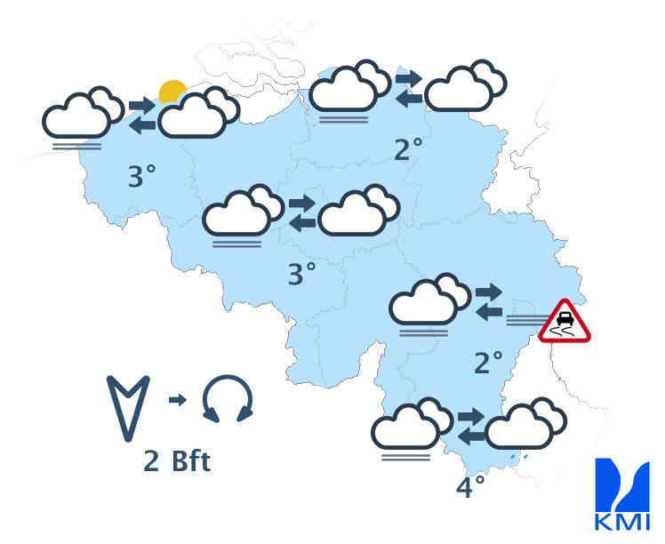 Maandag verwachten we nog steeds vrij veel wolken, maar plaatselijk ontstaan er ook opklaringen, vooral dan in delen van Vlaanderen en het centrum. Uit de lage wolken kan er hoofdzakelijk over het zuidoosten wat lichte neerslag vallen. De maxima schommelen van 0 of -1 graad in de Hoge Venen tot +4 of +5 graden langs de Franse grens. De wind is zwak en vaak variabel in het centrum of komt uit noordnoordoost in het westen en uit westnoordwest in het oosten. In de Ardennen is hij tijdelijk matig.