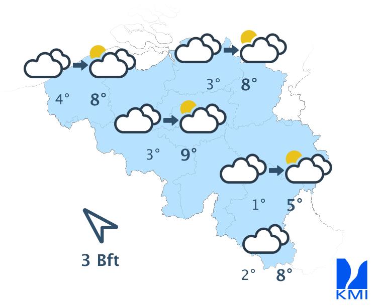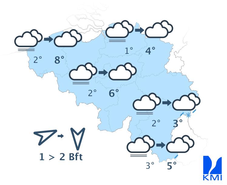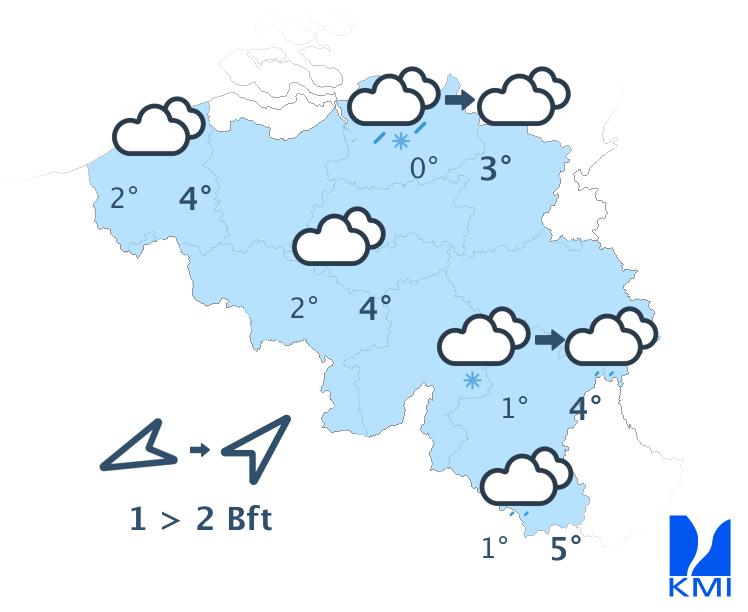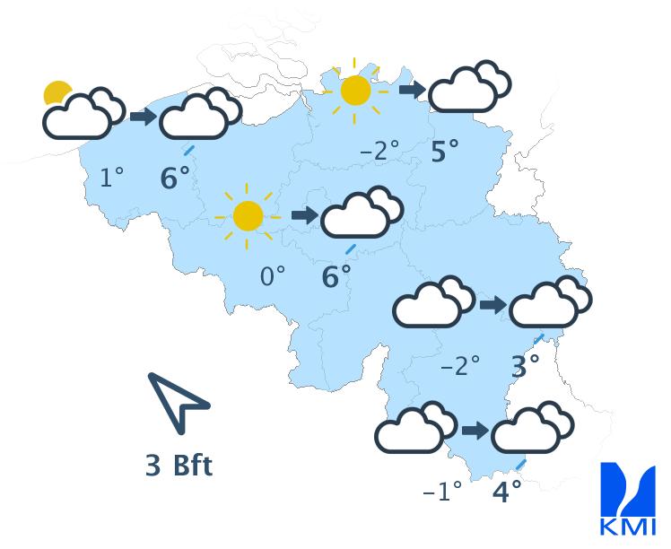 Deze voormiddag is het zwaarbewolkt en gaat het geleidelijk regenen over het westen en het centrum. Over het oosten is het aanvankelijk nog droog maar bewolkt. In het begin van de namiddag beïnvloedt de regenzone het hele land met op de Ardense hoogten zeer lokaal kans op wat smeltende sneeuw. We halen maxima van 1 graad in de Hoge Venen tot 6 graden in het uiterste westen. Er waait eerst een matige en zee soms een vrij krachtige zuidoostenwind. In de namiddag draait hij naar zuidelijke richtingen.