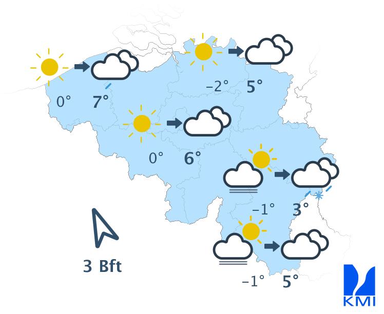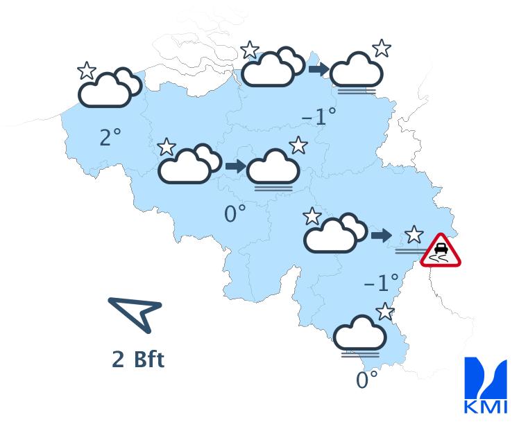Vanavond en vannacht blijft het overwegend zwaarbewolkt met in meerdere streken mist die kan aanvriezen over het oosten van land. Een neerslagzone beïnvloedt het oostelijk deel van het land met wat sneeuw op de Ardense hoogten. De minima schommelen van -1 tot +3 graden. De wind is meestal zwak en aan zee soms matig, uit noord tot noordoost of uit veranderlijke richtingen.