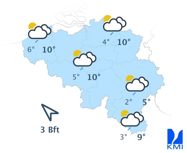 Vrijdagochtend verwachten we veel lage wolken in de Ardennen, maar brede opklaringen in vele andere streken. De bewolking neemt echter snel toe vanaf Frankrijk door de komst van een zwakke storing die in de loop van de voormiddag al voor af en toe wat regen zorgt in de westelijke landshelft en in de namiddag ook in het oosten. De maxima liggen tussen 2 graden in de Hoge Venen en 6 à 7 graden in het centrum. De wind waait matig uit zuidoost.