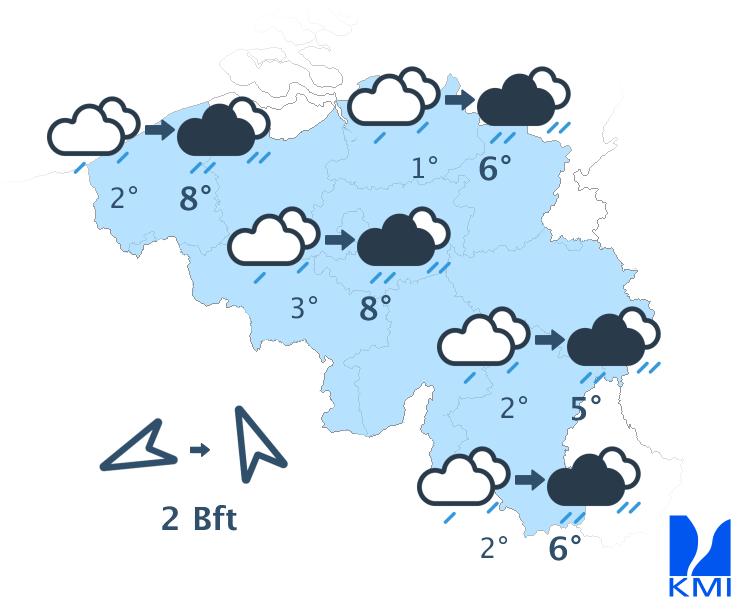 Dinsdag is het zwaarbewolkt met vooral in de voormiddag perioden van regen; over het noorden is het 's ochtends vroeg nog meestal droog (daar kan de eerste neerslag zeer tijdelijk wat winters zijn). Later overdag wordt het meestal droog vanuit het zuiden met mogelijk hier en daar een opklaring. In de loop van de namiddag neemt de kans op regen opnieuw toe in de streken langs de Franse grens. De maxima liggen tussen 3 en 8 graden. De matige oostenwind draait later overdag (met uitzondering van het uiterste noorden) naar het zuidoosten, later naar het zuiden. Op de Ardense hoogten zijn pieken tot 55 km/u mogelijk.