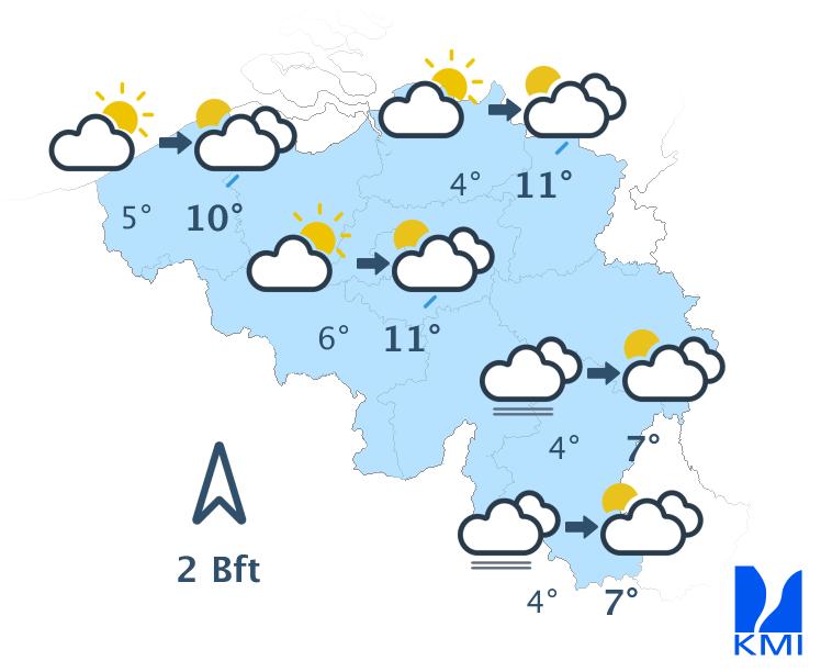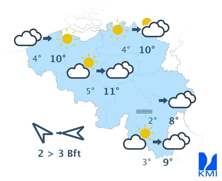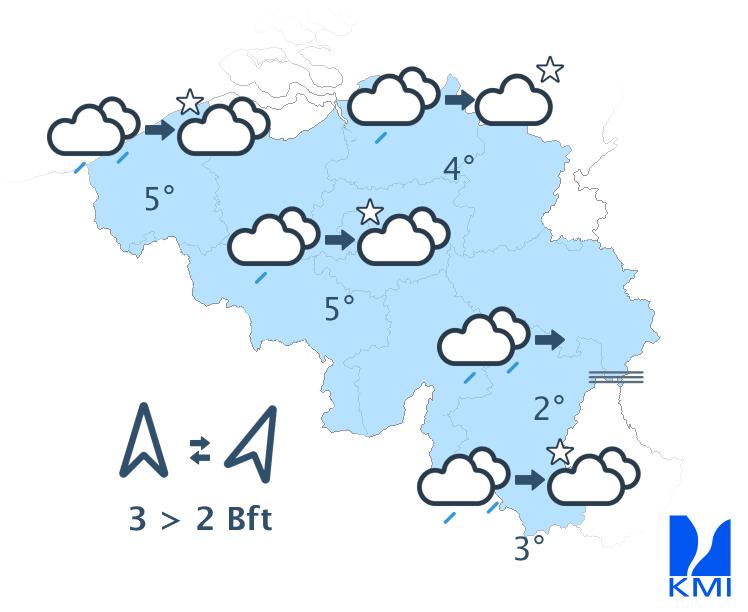 Vannacht zijn er tijdelijk soms nog brede opklaringen. Vooral over het zuiden echter blijft het veelal bewolkt. Later vannacht neemt de bewolking vanuit het zuiden en het zuidwesten toe. Op het einde van de nacht gaat het licht regenen over de zuidelijke landshelft (In de Hoge Venen kan de neerslag eventueel wat winters zijn). De minima schommelen rond 0 à -1 graad in de Hoge Ardennen, van 0 tot 3 graden in Laag- en Midden-België tot 4 graden langs de Franse grens. Er waait een matige wind uit oost tot zuidoost. Aan zee kan de wind af en toe vrij krachtig worden.