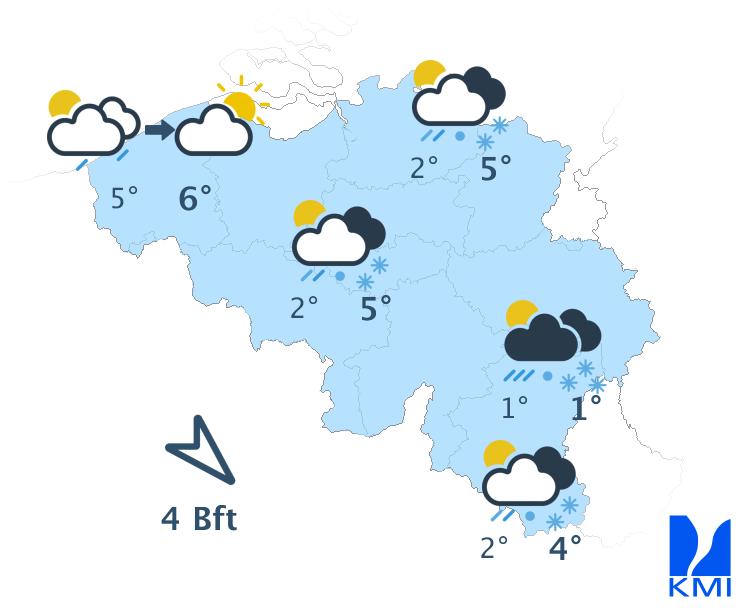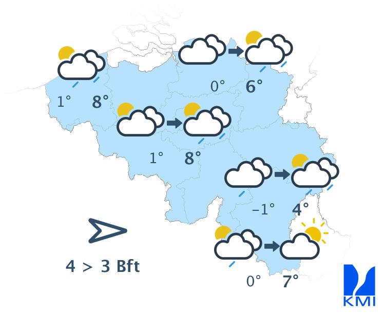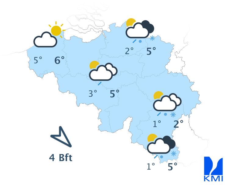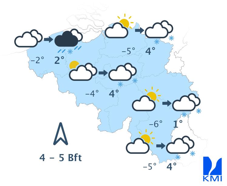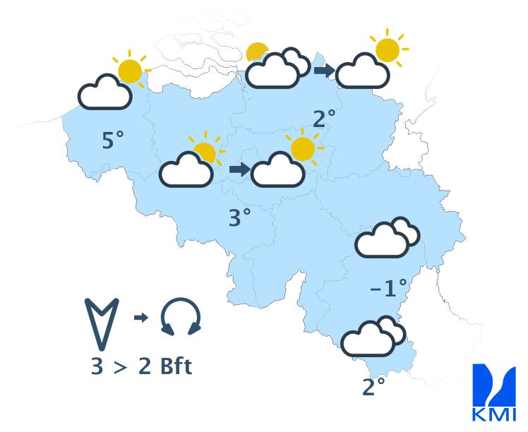 Vanochtend is het koud in het binnenland met in vele streken lichte vorst en kans op zeer lokale gladheid door ijsplekken (hoofdzakelijk in Hoog-België) en in de Hoge Venen mogelijk aanvriezende mistbanken. Eerst is het overal zwaarbewolkt. In de namiddag verschijnen er vanaf de kust (brede) opklaringen over de noordwestelijke landshelft. Over het zuidoostelijk deel blijft de bewolking dominant tot de late namiddag of avond en daar kan er lokaal wat zeer lichte winterse neerslag vallen. De maxima schommelen tussen -2 graden in de Hoge Venen, +2 à +3 graden in het centrum tot +5 graden aan de kust. De matige en schrale noordoostenwind draait naar het noorden. Aan zee is de wind aanvankelijk vrij krachtig of krachtig met rukwinden tot 55 km/u.
