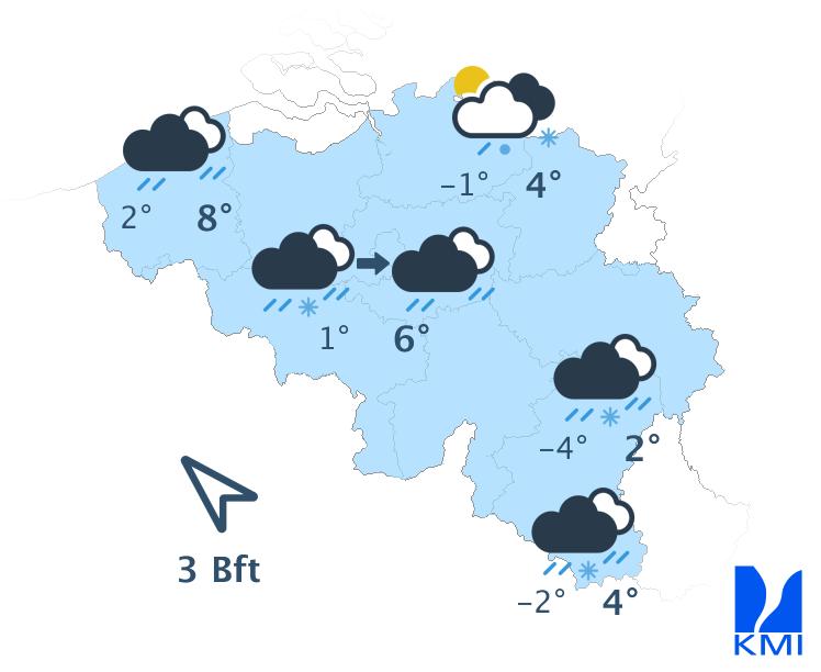 Maandag is het eerst zwaarbewolkt met enkele buien. Geleidelijk verschijnen er meer opklaringen, maar ontstaan er ook meer buien. Deze krijgen een winters karakter (regen, korrelhagel of natte sneeuw) met plaatselijk wat sneeuw op de hoogten, vooral tegen het einde van de dag en tijdens de daaropvolgende nacht. Enkele donderslagen zijn mogelijk. De maxima liggen tussen 1 à 3 graden in de Ardennen en schommelen van 6 tot 9 graden in de lagere streken. De wind is matig in het binnenland en vrij krachtig tot krachtig aan zee uit westelijke richtingen.