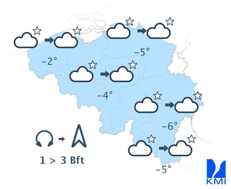 Vanavond is het lichtbewolkt met in het zuidoosten aanvankelijk nog wolken. Volgende nacht neemt de bewolking vanuit het westen toe, maar het blijft droog. In de oostelijke regio's blijft het nog lange tijd lichtbewolkt met sluierwolken. Het wordt een koude nacht met minima van -1 graad aan zee tot -6 graden in de Hoge Venen. De wind waait eerst zwak uit noordelijke tot veranderlijke richtingen, later wordt hij matig uit zuid.