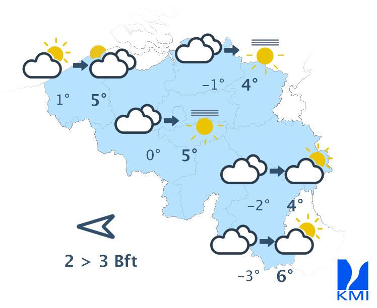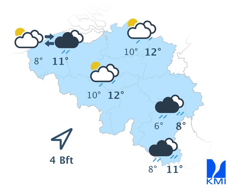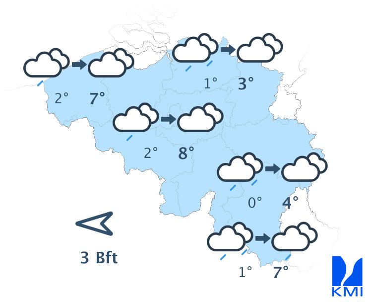 Vanavond en vannacht vallen er buien onder de vorm van regen, korrelhagel of smeltende sneeuw in Laag- en Midden-België. Op het reliëf gaat het eerder om buien van smeltende sneeuw of sneeuw. Een donderslag is niet uitgesloten. Vannacht verschijnen er opklaringen maar ten zuiden van Samber en Maas blijven de lage wolken dominant en zorgen ze plaatselijk voor een beperkt zicht. De minima schommelen tussen 0 graden in de Ardennen en +6 graden vlak aan zee. De wind is matig uit een westelijke hoek. Aan zee draait de wind naar het noordwesten en blijft hij vrij krachtig waaien.