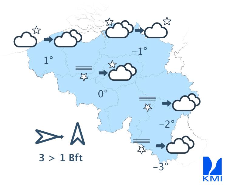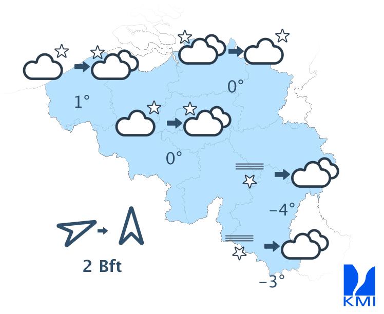 In de nacht van dinsdag op woensdag wordt het stilaan droog en rustiger met opklaringen maar wel met hoge en middelhoge wolkenvelden. Plaatselijk is er kans op rijm- en ijsplekken. De minima liggen tussen -4 graden in sommige Ardense valleien, rond 0 graden in het centrum en +1 graad in het uiterste westen. De wind wordt zwak veranderlijk.